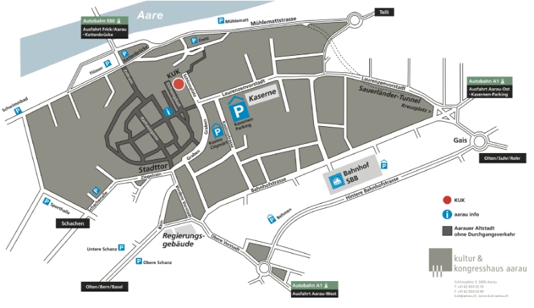 Sortie T5/Aarau-Ost, voie de droite direction Aarau/Suhr. Entrer dans la ville d’Aarau par la voie de gauche (Lucerne/Berne/Olten/Aarau) sur la Rohrerstrasse/Laurenzenvorstadt. La place du château avec le kultur & kongresshaus aarau se trouve à droite, environ 10 mètres avant l’entrée dans la vieille ville (il n’y a pas de possibilité de stationnement à cet endroit). Le parking le plus proche est le Kasernenparking.