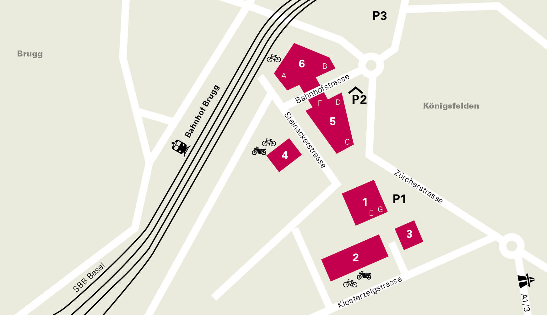 Le campus se trouve à moins d’une heure de Bâle, Berne, Zurich et à deux minutes à pied de la gare de Brugg. Il est parfaitement accessible par les transports publics.